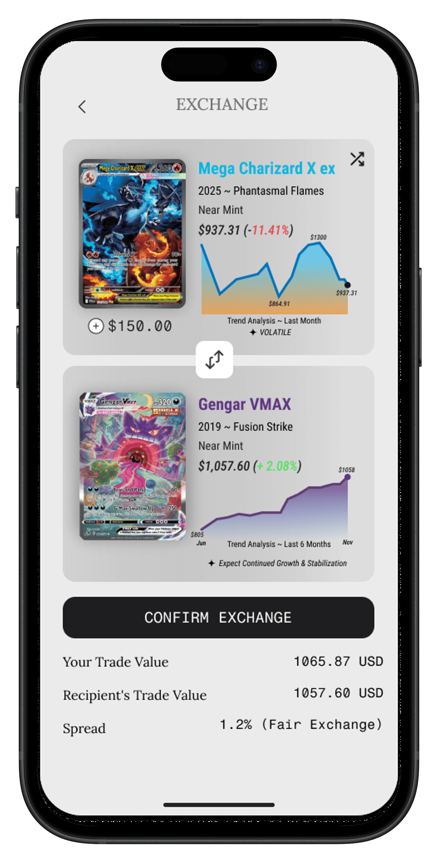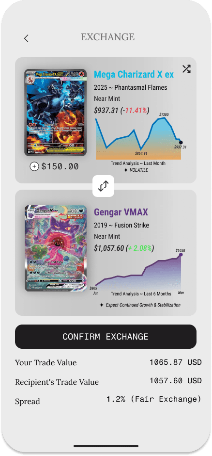 Our platform provides deep & relevant market insights on your cards - and the cards you trade for. Our large pool of data instills confidence in our AI-powered market analysis.